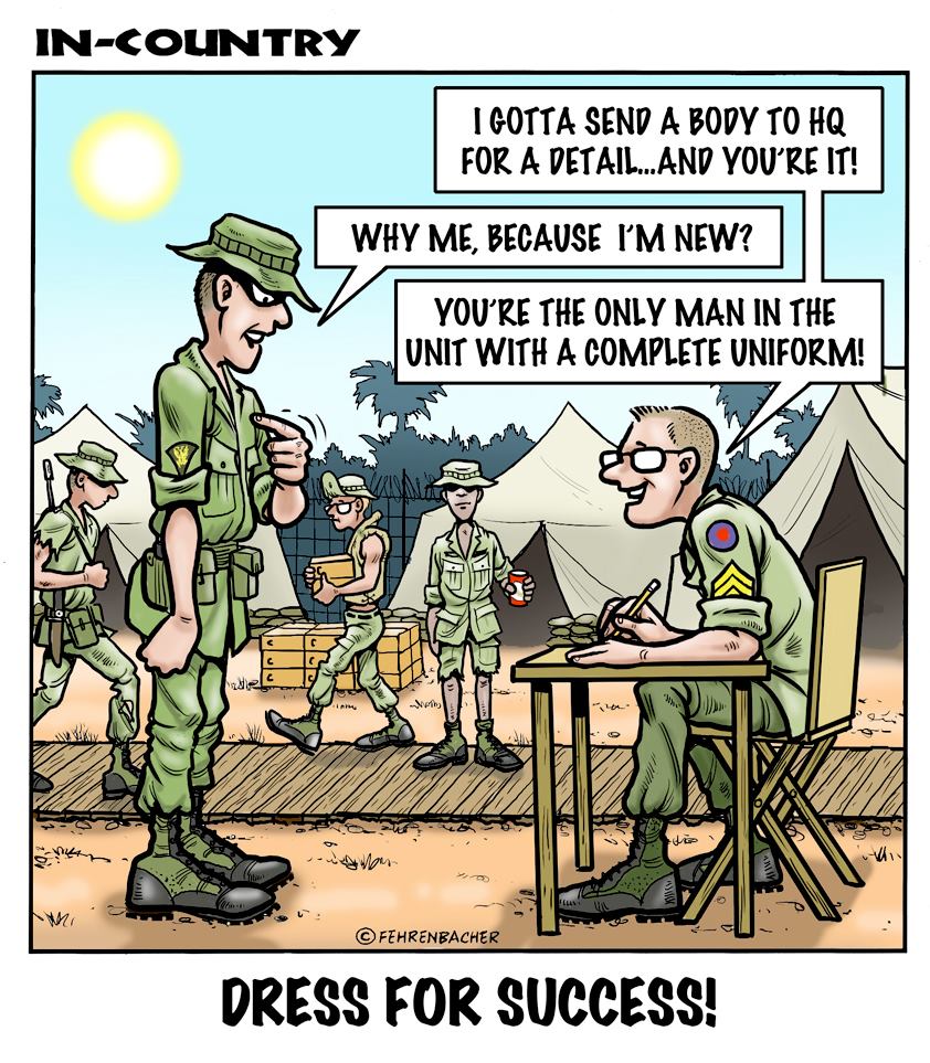 Phil enlisted in the Army in 1965 where you served for years in Vietnam.  He became a graphic designer and has worked for the state of Oregon for 26 years.  He retired in 2003 and started the Cartoon "In-Country".  The cartoons reflect his experiences during his tour of duty in South Vietnam.